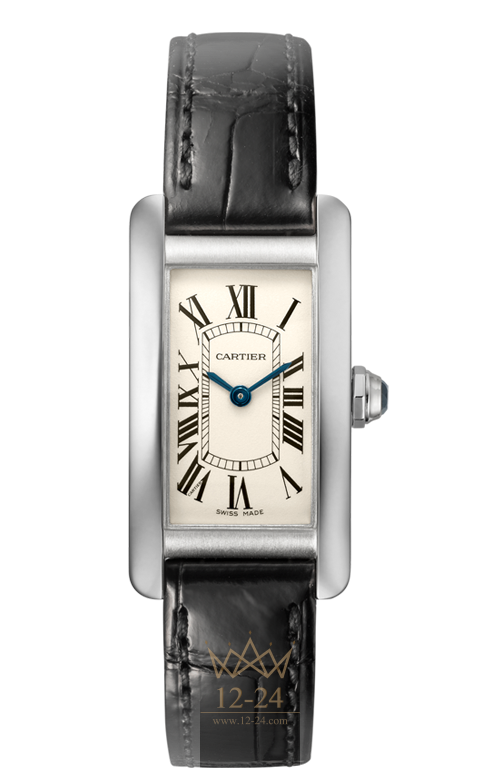 Часы Américaine, маленькая модель, кварцевый механизм, калибр Cartier 157. Корпус из белого золота 18 карат с родиевым покрытием, восьмигранная заводная головка украшена граненым сапфиром, посеребренный циферблат с круговым зернением, стрелки в форме мечей из вороненой стали, минеральное стекло, ремешок из кожи аллигатора, стандартная застежка из белого золота 18 карат с родиевым покрытием. Размеры корпуса: 34,80 мм х 19 мм. Высота корпуса: 6,32 мм. Водонепроницаемость до 30 метров.
