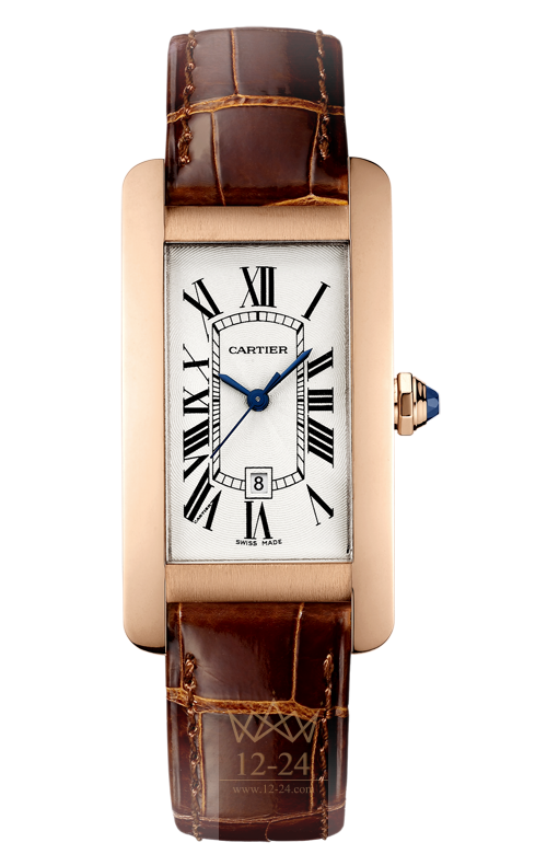 Часы Américaine, модель среднего размера, механизм с автоматическим подзаводом, калибр Cartier 077. Корпус из розового золота 18 карат, восьмигранная заводная головка из розового золота 18 карат украшена сапфиром, посеребренный гильошированный в технике flinqué циферблат, римские цифры, стрелки в форме мечей из вороненой стали, сапфировое стекло, ремешок из кожи аллигатора, стандартная застежка из розового золота 18 карат, окошко календаря в положении “6 часов”. Размеры корпуса: 41,60 мм х 22,60 мм. Высота корпуса: 9,65 мм. Водонепроницаемость до 30 метров.