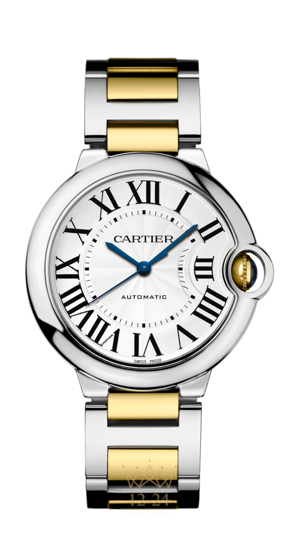 Часы Ballon Bleu de Cartier (W2BB0012), 36 мм, механизм с автоматическим подзаводом. Корпус из стали, рифленая заводная головка из желтого золота 18 карат, синтетическая шпинель в форме кабошона, опаловый посеребренный гильошированный циферблат, римские цифры, стрелки в форме мечей из вороненой стали, сапфировое стекло, браслет из желтого золота 18 карат и стали. Размеры корпуса: диаметр: 36 мм, высота: 12,05 мм. Водонепроницаемость до 3 бар (~30 метров).