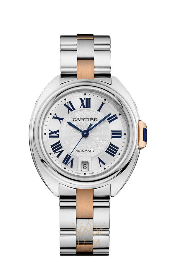 Часы Clé de Cartier, 35 мм, механизм с автоматическим подзаводом, калибр 1847 MC. Корпус из стали. Ключ из розового золота 18 карат с синтетической шпинелью. Посеребренный гильошированный в технике flinqué циферблат с узором “солнечные лучи”, римские цифры. Стрелки в форме мечей из вороненой стали. Сапфировые стекло и задняя крышка. Браслет из розового золота 18 карат и стали. Высота корпуса: 10,09 мм. Водонепроницаемость до 3 бар (30 метров).