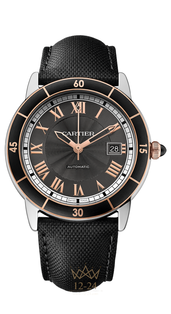 Часы Ronde Croisière de Cartier (W2RN0005), 42 мм, механизм с автоматическим подзаводом, калибр 1847 MC. Корпус из стали, ободок из стали с покрытием из розового золота и ADLC-покрытием, рифленая заводная головка из розового золота 18 карат с черной синтетической шпинелью в форме кабошона, циферблат серого цвета, накладные элементы с позолоченной отделкой, стрелки в форме мечей с позолоченной отделкой, сапфировое стекло, ремешок из кожи теленка черного цвета, двойная регулируемая раскладывающаяся застежка из стали, окошко календаря в положении «3 часа». Размеры корпуса: диаметр: 42 мм, высота: 9,7 мм. Водонепроницаемость до 10 бар (~100 метров).