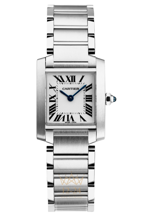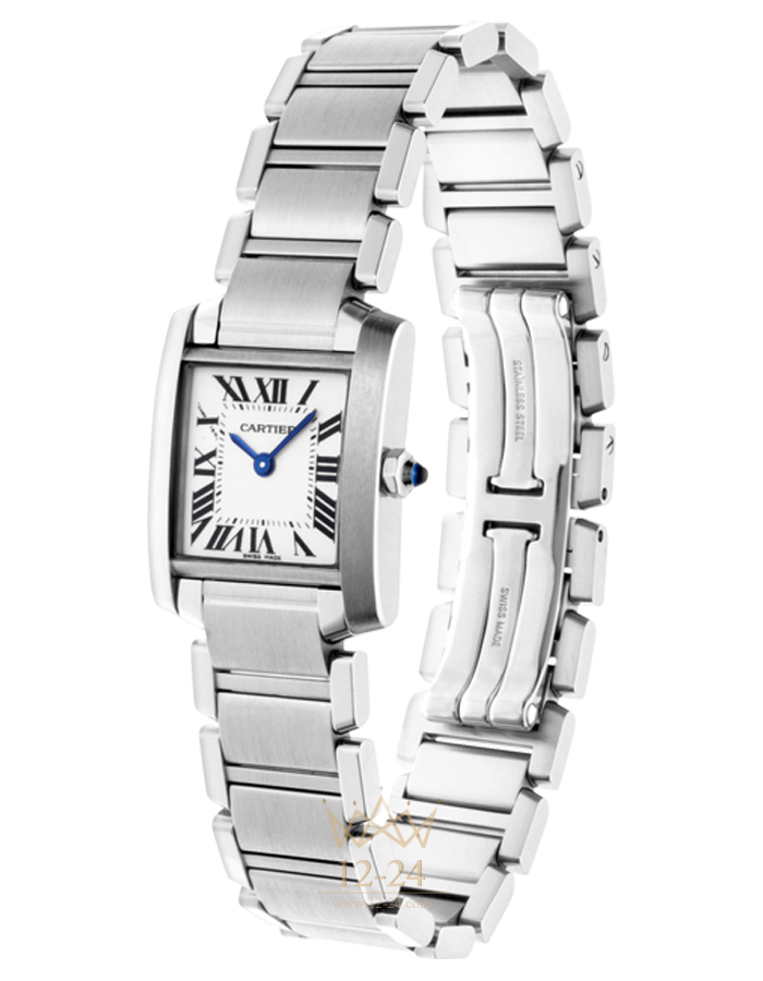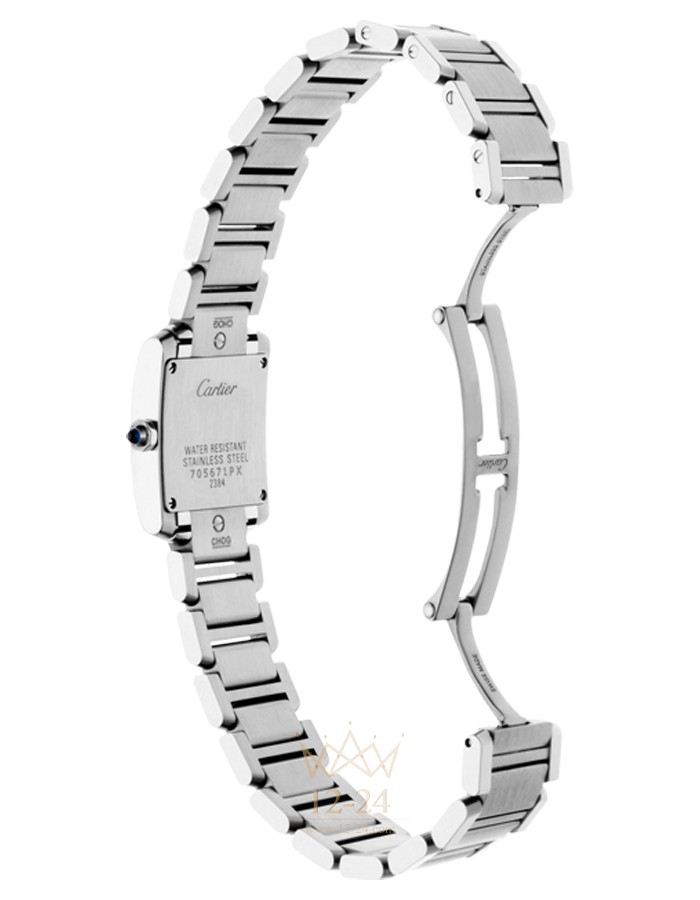 Часы Française, маленькая модель, кварцевый механизм, калибр Cartier 057. Корпус из стали, восьмигранная заводная головка украшена синтетической шпинелью в форме кабошона, посеребренный циферблат с круговым зернением, стрелки в форме мечей из вороненой стали, сапфировое стекло, браслет из стали, тройная раскладывающаяся застежка из стали. Размеры корпуса: 25,35 мм х 20,30 мм. Высота корпуса: 5,94 мм. Водонепроницаемость до 30 метров.