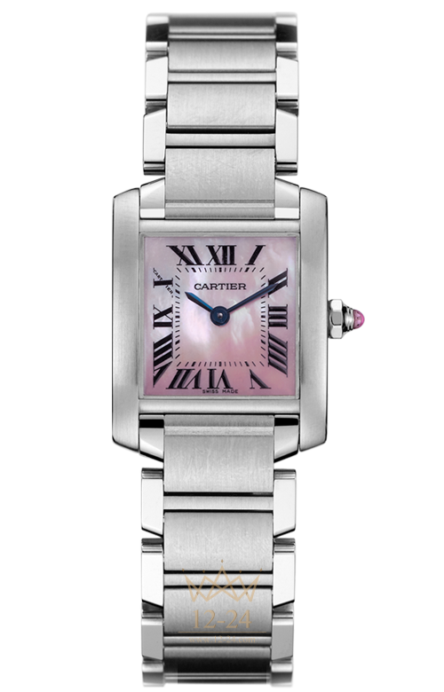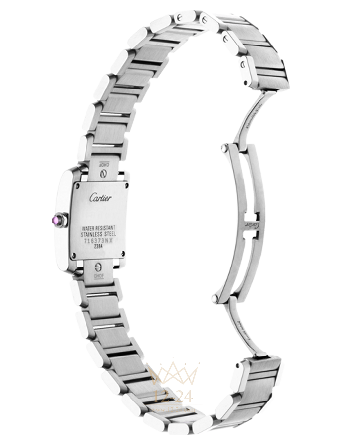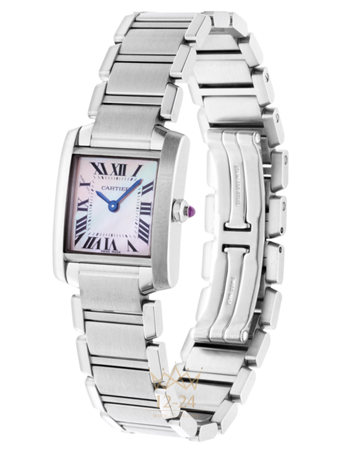 Часы Française, маленькая модель, кварцевый механизм, калибр Cartier 057. Корпус из стали, восьмигранная заводная головка украшена синтетической шпинелью в форме кабошона, циферблат из розового перламутра, стрелки в форме мечей из вороненой стали, сапфировое стекло, браслет из стали, тройная раскладывающаяся застежка из стали. Размеры корпуса: 25,35 мм х 20,30 мм. Высота корпуса: 5,94 мм. Водонепроницаемость до 30 метров.