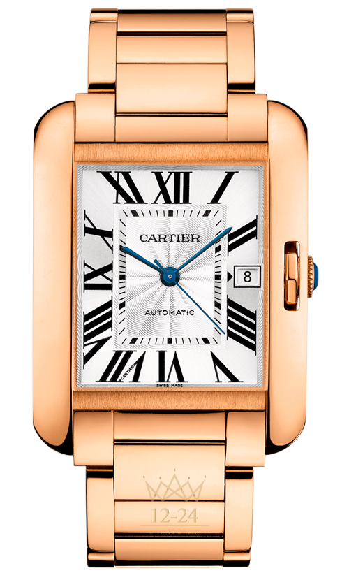 Часы Tank Anglaise, большая модель, механизм с автоматическим подзаводом, калибр 1904 MC. Корпус из розового золота 18 карат, девятигранная заводная головка украшена сапфиром, посеребренный гильошированный в технике flinqué циферблат с лаковым покрытием, стрелки в форме мечей из вороненой стали, сапфировое стекло, браслет из розового золота 18 карат, размер запястья 185 мм, окошко календаря в положении “3 часа”, задняя крышка из сапфирового стекла. Размеры корпуса: 47 мм х 36,20 мм. Высота корпуса: 9,82 мм. Водонепроницаемость до 30 метров.