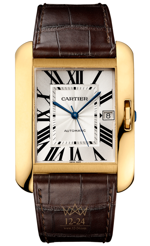 Часы Tank Anglaise, большая модель, механизм с автоматическим подзаводом, калибр 1904 MC. Корпус из желтого золота 18 карат, девятигранная заводная головка с сапфиром, посеребренный гильошированный в технике flinqué циферблат с лаковым покрытием, римские цифры, стрелки в форме мечей из вороненой стали, сапфировое стекло, ремешок из кожи аллигатора, двойная регулируемая раскладывающаяся застежка из желтого золота 18 карат, окошко календаря в положении “3 часа”, прозрачная задняя крышка из сапфирового стекла. Размеры корпуса: 36,2 мм х 47 мм. Высота корпуса: 9,82 мм. Водонепроницаемость до 30 метров.