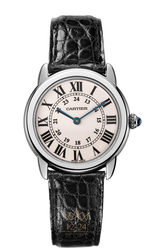 Часы Ronde Solo, маленькая модель, кварцевый механизм, калибр Cartier 690. Корпус из стали, заводная головка с зернистой отделкой украшена синтетической шпинелью в форме кабошона, посеребренный светлый опаловый циферблат, римские и арабские цифры, стрелки в форме мечей из вороненой стали, сапфировое стекло, ремешок из кожи аллигатора с округлым рисунком, двойная регулируемая раскладывающаяся застежка из стали. Размеры корпуса: диаметр 29,50 мм, высота 6,35 мм. Водонепроницаемость до 30 метров.