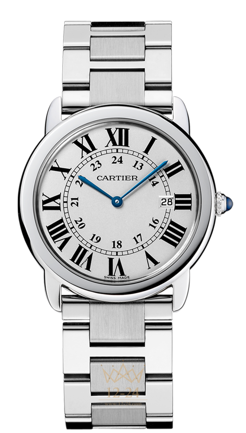 Часы Ronde Solo - Quartz, большая модель, кварцевый механизм, калибр Cartier 115А. Корпус из стали, заводная головка с зернистой отделкой из стали украшена синтетической шпинелью в форме кабошона, посеребренный опаловый циферблат, римские и арабские цифры, стрелки в форме мечей из вороненой стали, сапфировое стекло, браслет из стали, окошко календаря в положении “3 часа”. Размеры корпуса: диаметр 36 мм, высота 6,51 мм. Водонепроницаемость до 30 метров.