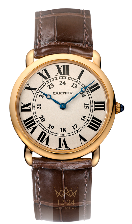 Римские цифры, синие стрелки в форме мечей, заводное устройство с сапфиром в форме кабошона, шкала в стиле “железная дорога”. Ronde Louis Cartier – классика часового искусства Cartier. Все модели из розового или белого золота, стандартные или украшенные бриллиантами, оснащены ремешком из кожи аллигатора.