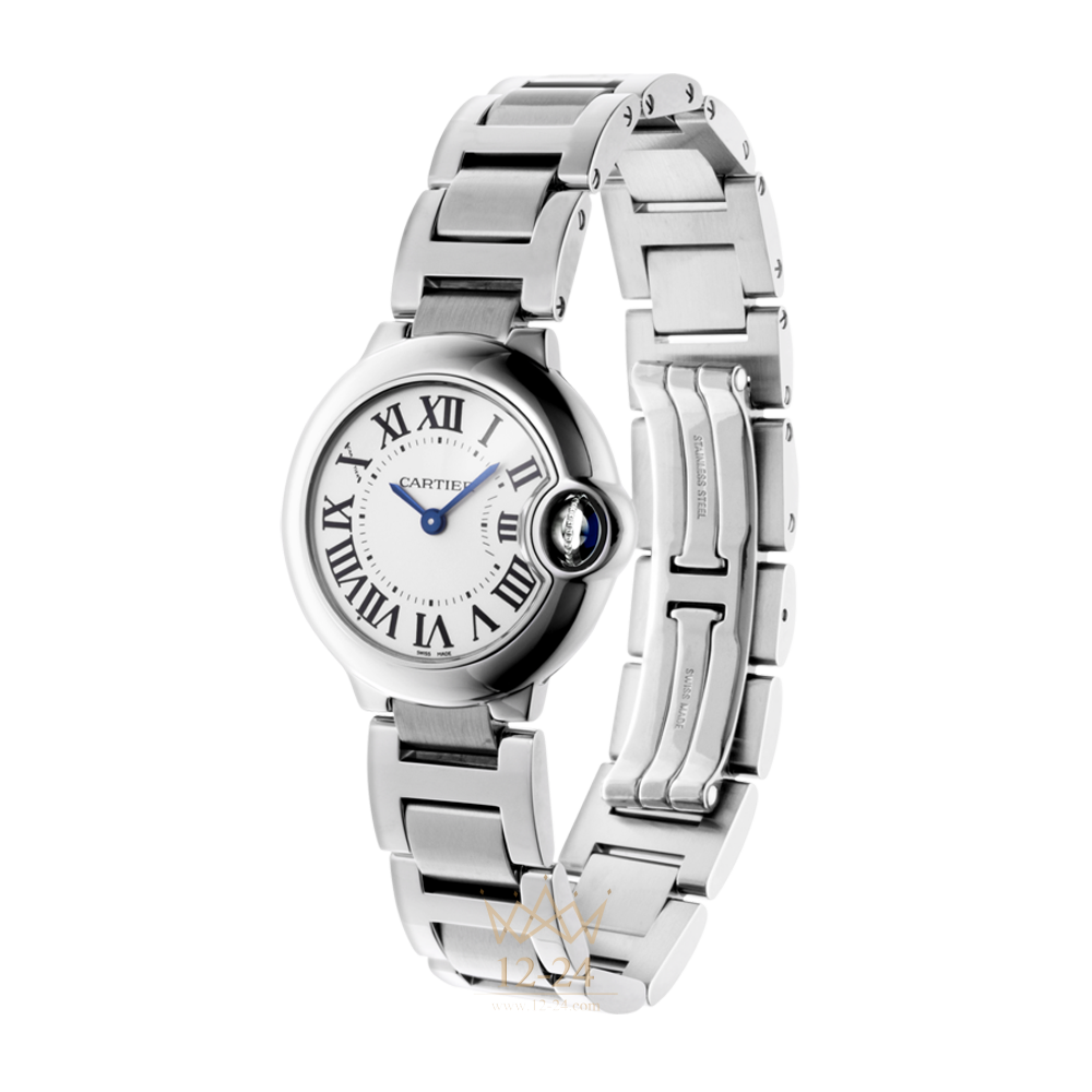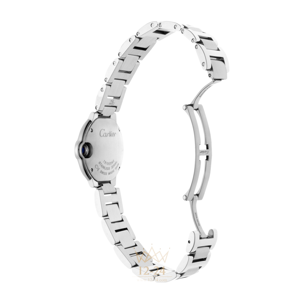 Часы Quartz, 28 мм, кварцевый механизм, калибр Cartier 057. Корпус из стали, рифленая заводная головка украшена синтетической шпинелью в форме кабошона, посеребренный опаловый циферблат, римские цифры, стрелки в форме мечей из вороненой стали, сапфировое стекло, браслет из стали. Размеры корпуса: диаметр 28,60 мм, высота 9,35 мм. Водонепроницаемость до 30 метров.