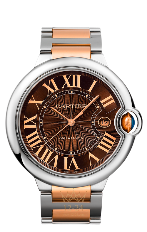 Часы Ballon Bleu de Cartier, 42 мм, механизм с автоматическим подзаводом, калибр Cartier 049. Корпус из стали, рифленая заводная головка из розового золота 18 карат украшена синтетической шпинелью в форме кабошона, гильошированный циферблат шоколадного цвета, римские цифры, стрелки в форме мечей из стали с покрытием из розового золота, сапфировое стекло, браслет из розового золота 18 карат и стали, окошко календаря в положении “3 часа”. Размеры корпуса: диаметр 42 мм, высота 13 мм. Водонепроницаемость до 30 метров.