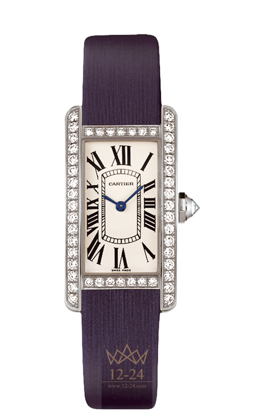 Часы Américaine, маленькая модель, кварцевый механизм, калибр Cartier 157. Корпус из белого золота 18 карат с родиевым покрытием украшен 48 бриллиантами, девятигранная заводная головка с бриллиантом, общий вес бриллиантов 0,97 карата. Циферблат с круговым зернением. Стрелки в форме мечей из вороненой стали. Минеральное стекло. Ремешок из ткани, двойная регулируемая раскладывающаяся застежка из белого золота 18 карат с родиевым покрытием, длина застежки 12 мм. Размеры корпуса: 34,80 мм x 19 мм. Высота корпуса: 7,34 мм. Водонепроницаемость до 30 метров.