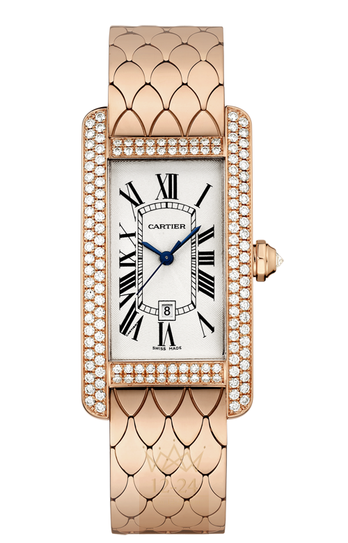 Часы Américaine, средняя модель, механизм с автоматическим подзаводом, калибр Cartier 077. Корпус из розового золота 18 карат со 142 бриллиантами, граненая заводная головка с бриллиантом, общий вес бриллиантов 1,37 карата. Посеребренный гильошированный в технике flinqué циферблат. Стрелки в форме мечей из вороненой стали. Минеральное стекло. Браслет из розового золота 18 карат, размер запястья 170 мм. Размеры корпуса: 41,6 мм x 22,6 мм. Высота корпуса: 9,65 мм. Водонепроницаемость до 30 метров.