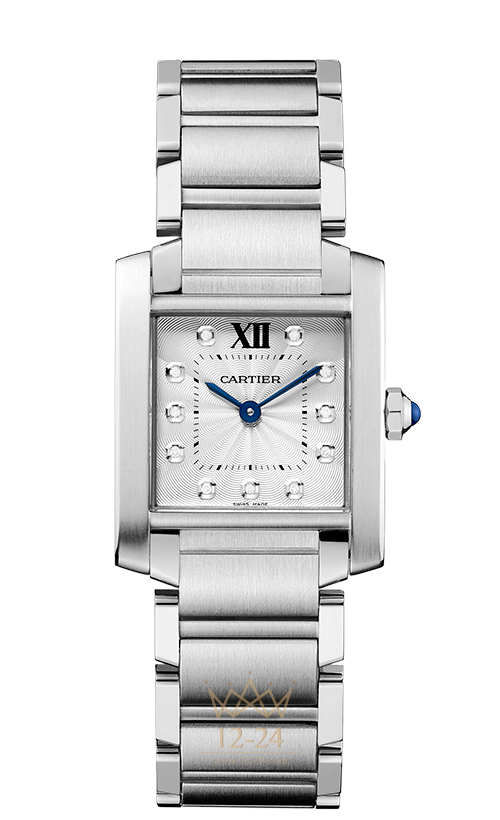 Часы Tank Française, модель среднего размера. Кварцевый механизм. Корпус из стали, восьмигранная заводная головка украшена синтетической шпинелью в форме кабошона. Посеребренный гильошированный в технике flinqué циферблат с лаковым покрытием украшен 11 бриллиантами классической огранки. Стрелки в форме мечей из вороненой стали. Сапфировое стекло. Браслет из стали. Водонепроницаемость до 30 метров. Размеры корпуса: 30,40 мм x 25,05 мм.