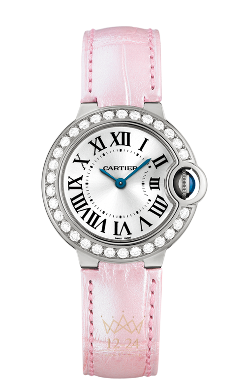 Часы Quartz, 28 мм, кварцевый механизм, калибр Cartier 057. Корпус из белого золота 18 карат с родиевым покрытием украшен 30 бриллиантами общим весом 0,97 карата. Рифленая заводная головка с сапфиром в форме кабошона. Посеребренный опаловый циферблат с лаковым покрытием. Стрелки в форме мечей из вороненой стали. Сапфировое стекло. Ремешок из перламутровой кожи аллигатора розового цвета, двойная регулируемая раскладывающаяся застежка из белого золота 18 карат с родиевым покрытием. Высота корпуса: 9,35 мм. Водонепроницаемость до 30 метров.