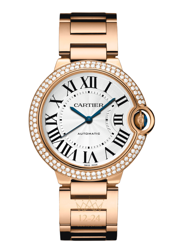 Часы Self-winding, 36 мм, механизм с автоматическим подзаводом, калибр Cartier 076. Корпус из розового золота 18 карат украшен 123 бриллиантами общим весом 1,21 карата. Рифленая заводная головка с сапфиром в форме кабошона. Посеребренный гильошированный опаловый циферблат с лаковым покрытием. Стрелки в форме мечей из вороненой стали. Сапфировое стекло. Браслет из розового золота 18 карат, размер запястья 180 мм. Высота корпуса: 12,1 мм. Водонепроницаемость до 30 метров.