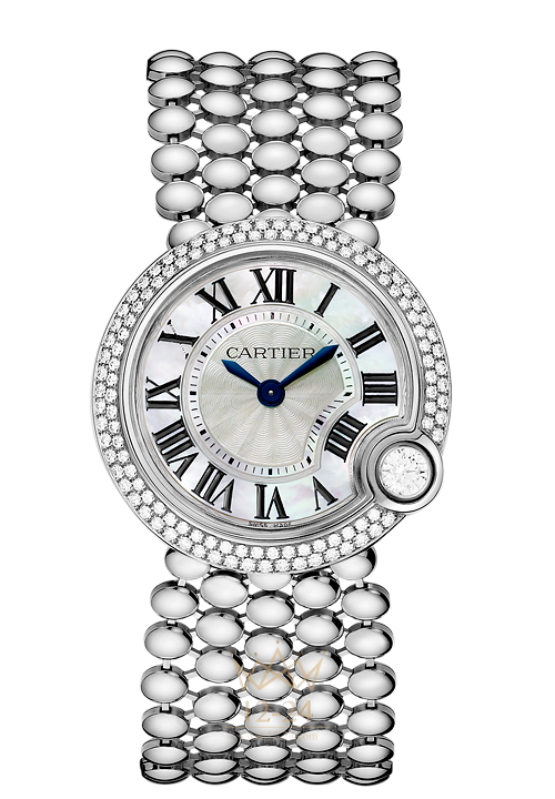 В коллекции Ballon de Cartier представлены драгоценные женские модели часов, сочетающие в себе лучшие традиции Дома и новый дизайн. Пять рядов изящных бусин, украшенных в технике паве или с гладкой поверхностью, создают впечатление, будто гильошированный в технике flinqué циферблат из перламутра парит в воздухе. Изысканность циферблата подчеркивается сиянием уникального бриллианта, украшающего его изгибы. Эти невесомые и грациозные часы воплощают непревзойденное ювелирное и часовое мастерство Дома.