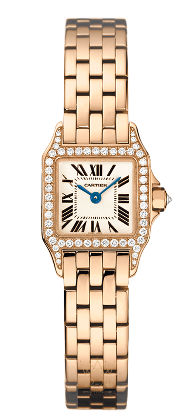 Часы Demoiselle, модель “мини”, кварцевый механизм, калибр Cartier 059. Корпус из розового золота 18 карат украшен 48 бриллиантами, восьмигранная заводная головка с бриллиантом, общий вес бриллиантов 0,37 карата. Посеребренный циферблат с круговым зернением. Стрелки в форме мечей из вороненой стали. Сапфировое стекло. Браслет из розового золота 18 карат, размер запястья 167 мм. Длина: 24 мм. Ширина: 18,7 мм. Высота: 5,5 мм. Водонепроницаемость до 30 метров.