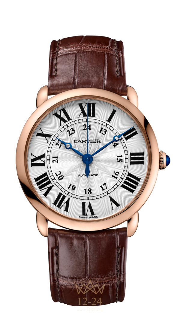Часы Ronde Louis Cartier (WGRN0006), 36 мм, механизм с автоматическим подзаводом, калибр 1847 MC. Корпус из розового золота 18 карат, заводная головка с зернистой отделкой и сапфиром в форме кабошона, посеребренный циферблат, гильошированный в технике «flinqué», брегетные стрелки из вороненой стали, сапфировое стекло, ремешок из полу-матовой кожи аллигатора коричневого цвета, стандартная застежка 18 мм из розового золота 18 карат, задняя крышка из сапфирового стекла. Высота корпуса: 9 мм. Водонепроницаемость до 3 бар (30 метров).