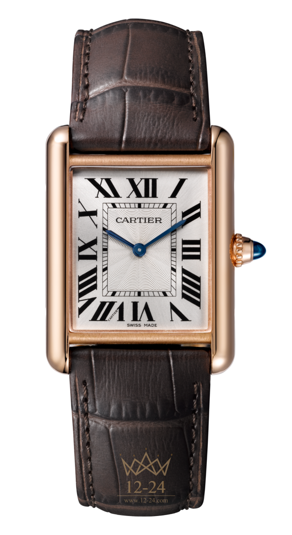 Часы Tank Louis Cartier (WGTA0011) большая модель, механизм с ручным подзаводом, калибр 8971 MC. Корпус из розового золота 18 карат, заводная головка с зернистой отделкой и сапфиром в форме кабошона, посеребренный циферблат с зернистой отделкой, стрелки в форме мечей из вороненой стали, минеральное стекло, ремешок из полу-матовой кожи аллигатора коричневого цвета, стандартная застежка из розового золота 18 карат. Размеры корпуса: 33,7 мм x 25,5 мм. Высота корпуса: 6,6 мм. Водонепроницаемость до 3 бар (~30 метров).