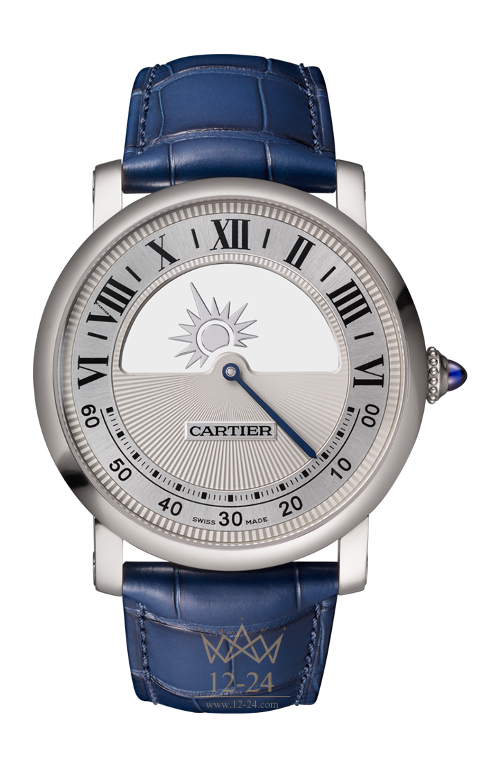 Часы Rotonde de Cartier (WHRO0043). Загадочный указатель день/ночь, механизм с ручным подзаводом, калибр 9982 MC. Корпус 40 мм из белого золота 18 карат, заводная головка из белого золота 18 карат с зернистой отделкой, синий сапфир в форме кабошона, гальванизированный гильошированный циферблат серебристого цвета с эффектом «солнечные лучи», декалькированные черные римские цифры. Посеребренные часовые метки индикатора дня и ночи, минутная стрелка в форме меча из вороненой стали.