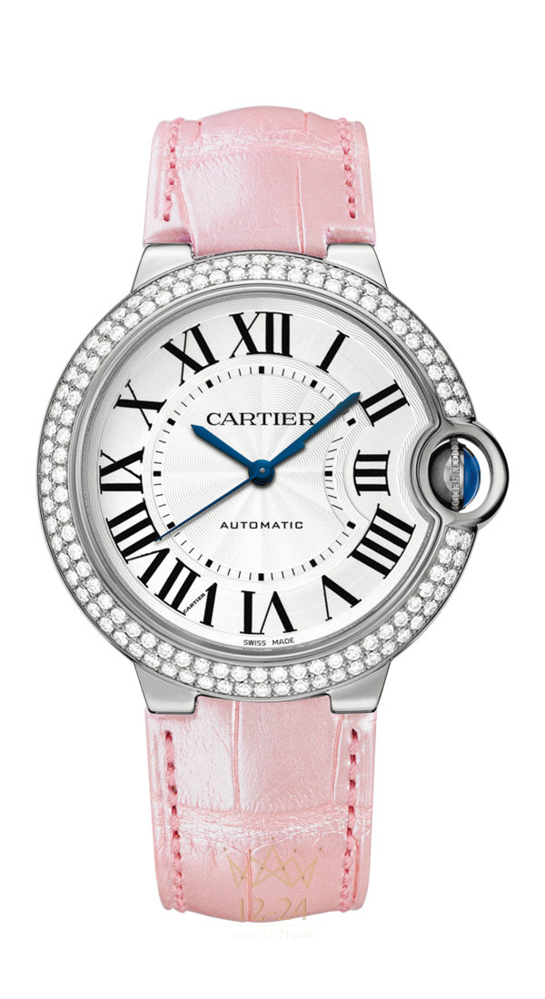 Часы Ballon Bleu de Cartier (WJBB0011) 36 мм, механизм с автоматическим подзаводом. Корпус из белого золота 18 карат с родиевым покрытием, 123 бриллианта общим весом 1,21 карата. Рифленая заводная головка с сапфиром в форме кабошона. Посеребренный гильошированный опаловый циферблат с лаковым покрытием. Стрелки в форме мечей из вороненой стали. Сапфировое стекло. Ремешок из перламутровой кожи аллигатора розового цвета, двойная регулируемая раскладывающаяся застежка 16 мм из белого золота 18 карат с родиевым покрытием. Высота корпуса: 12,1 мм. Водонепроницаемость до 3 бар (~30 метров).