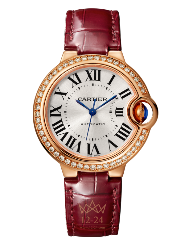Часы Ballon Bleu de Cartier, 36 мм, механизм с автоматическим подзаводом. Корпус из розового золота 18 карат с бриллиантами классической огранки. Рифленая заводная головка с сапфиром в форме кабошона. Посеребренный циферблат с эффектом "солнечные лучи". Стрелки в форме мечей из вороненой стали. Сапфировое стекло. Ремешок из кожи аллигатора бордового цвета, стандартная застежка из розового золота 18 карат. Высота корпуса: 12,1 мм. Водонепроницаемость до 3 бар (~30 метров).
