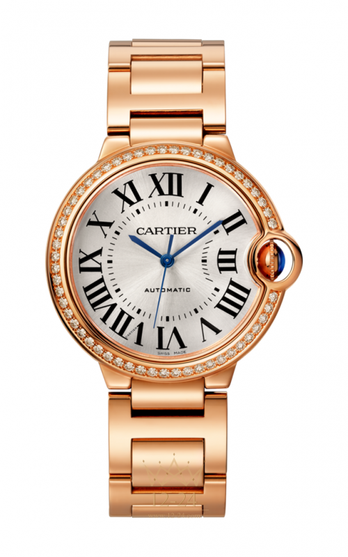 Часы Ballon Bleu de Cartier, 36 мм, механизм с автоматическим подзаводом. Корпус из розового золота 18 карат с бриллиантами классической огранки. Рифленая заводная головка с сапфиром в форме кабошона. Посеребренный циферблат с эффектом "солнечные лучи". Стрелки в форме мечей из вороненой стали. Сапфировое стекло. Браслет из розового золота 18 карат. Толщина корпуса: 12,1 мм. Водонепроницаемость до 3 бар (~30 метров).