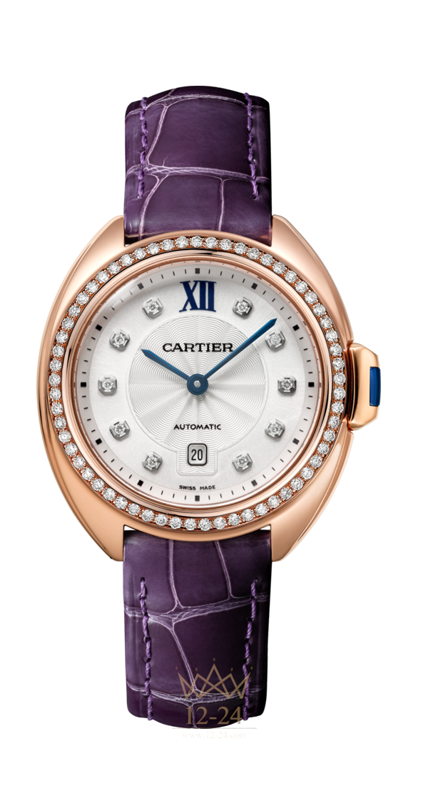 Часы Clé de Cartier (WJCL0038) 31 мм, механизм с автоматическим подзаводом. Корпус из розового золота 18 карат с бриллиантами классической огранки, диаметр: 31 мм, высота: 11,04 мм, ключ с сапфиром, гильошированный в технике «flinqué» циферблат с узором «солнечные лучи», 10 бриллиантов классической огранки, стрелки в форме мечей из вороненой стали, ремешок из блестящей кожи аллигатора баклажанового цвета, двойная регулируемая раскладывающаяся застежка из розового золота 18 карат, водонепроницаемость до 3 бар (30 метров).