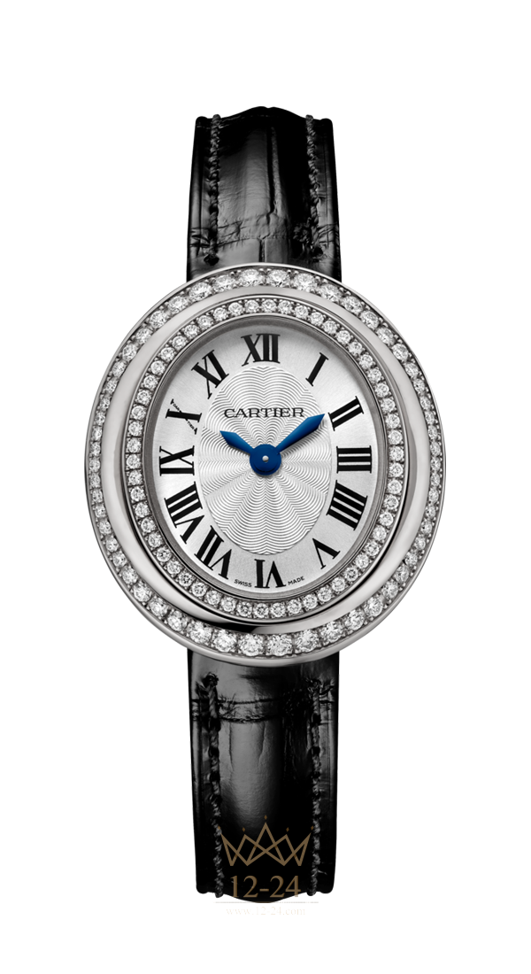 Часы Hypnose (WJHY0004) маленькая модель, кварцевый механизм. Корпус из белого золота 18 карат с родиевым покрытием, бриллианты классической огранки, длина 30 мм, ширина 26,2 мм, высота 7,5 мм. Посеребренный гильошированный в технике «flinqué циферблат с узором «солнечные лучи», стрелки в форме мечей из вороненой стали, сапфировое стекло. Ремешок из блестящей кожи аллигатора черного цвета, раскладывающаяся застежка из белого золота 18 карат с родиевым покрытием. Водонепроницаемость до 3 бар (около 30 метров).