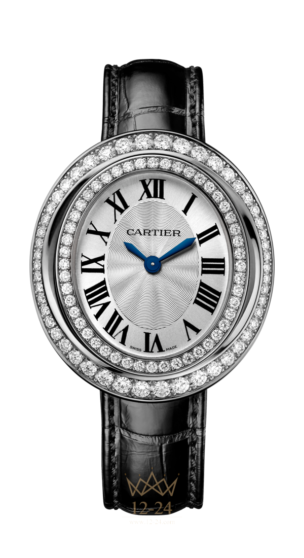 Часы Hypnose (WJHY0005) модель среднего размера, кварцевый механизм. Корпус из белого золота 18 карат с родиевым покрытием, бриллианты классической огранки, длина 37,8 мм, ширина 33,3 мм, высота 7,6 мм. Посеребренный гильошированный в технике «flinqué» циферблат с узором «солнечные лучи», стрелки в форме мечей из вороненой стали, сапфировое стекло. Ремешок из блестящей кожи аллигатора черного цвета, раскладывающаяся застежка из белого золота 18 карат с родиевым покрытием. Водонепроницаемость до 3 бар (около 30 метров).