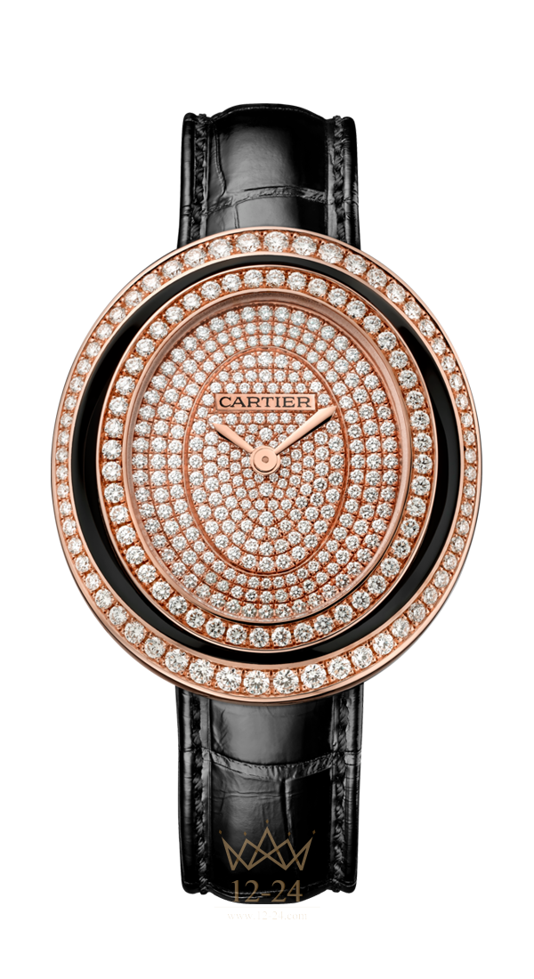 Часы Hypnose (WJHY0007) модель среднего размера, кварцевый механизм. Корпус из розового золота 18 карат с бриллиантами классической огранки, длина 37,8 мм, ширина 33,3 мм, высота 7,6 мм. Черный лак. Циферблат из розового золота 18 карат, бриллианты классической огранки, стрелки в форме мечей из стали с отделкой золотом, сапфировое стекло. Ремешок из блестящей кожи аллигатора черного цвета, раскладывающаяся застежка из розового золота 18 карат. Водонепроницаемость до 3 бар (около 30 метров).