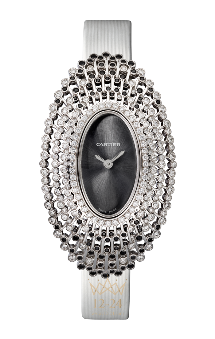 Часы коллекции Cartier Libre (WJLI0006), кварцевый механизм. Корпус из белого золота с бриллиантами и черными шпинелями, черный циферблат, ремешок из ткани и кожи аллигатора, стандартная застежка из белого золота с бриллиантами. Водонепроницаемость до 3 бар (~30 метров). Ограниченная серия из 50 индивидуально пронумерованных экземпляров.