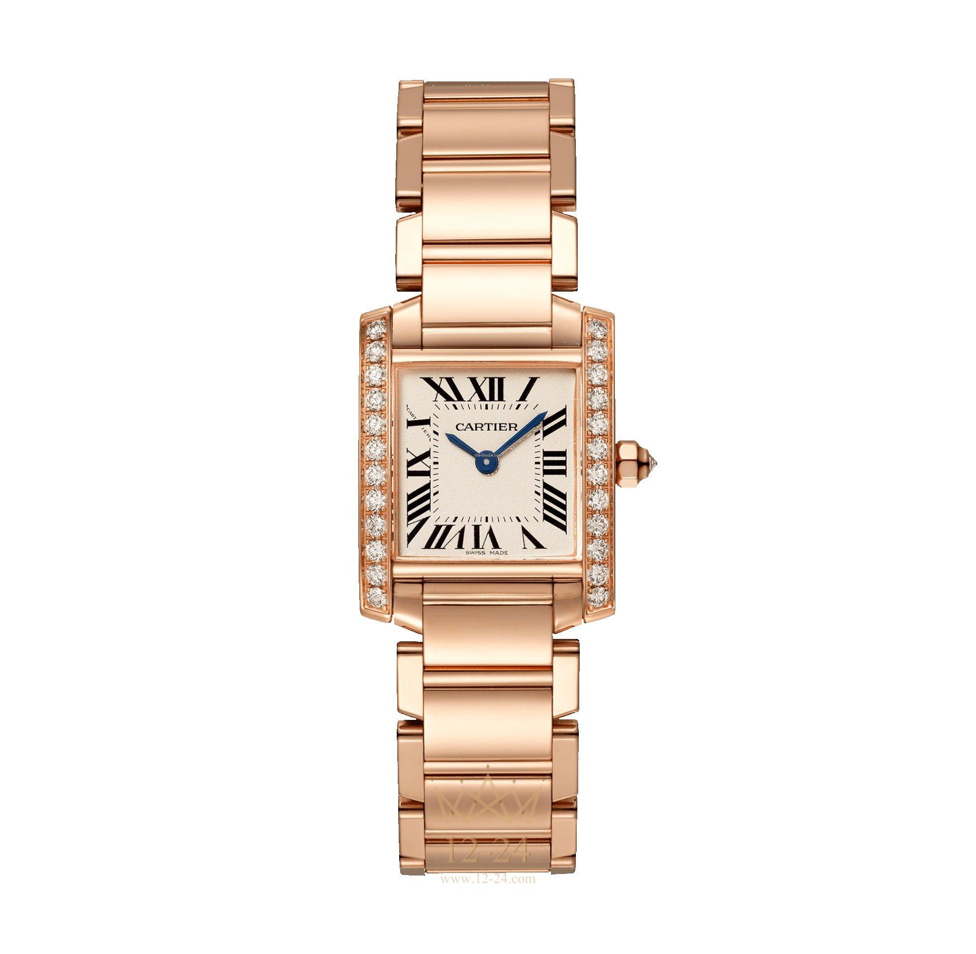 Часы Tank Française, маленькая модель, кварцевый механизм. Корпус из розового золота 18 карат с бриллиантами классической огранки. Восьмигранная заводная головка из розового золота 18 карат, бриллиант классической огранки. Посеребрённый циферблат, стрелки в форме мечей из воронёной стали, сапфировое стекло. Браслет из розового золота 18 карат. Размеры корпуса: 25 x 20 мм, толщина: 6,15 мм. Водонепроницаемость до 3 бар (~30 метров).