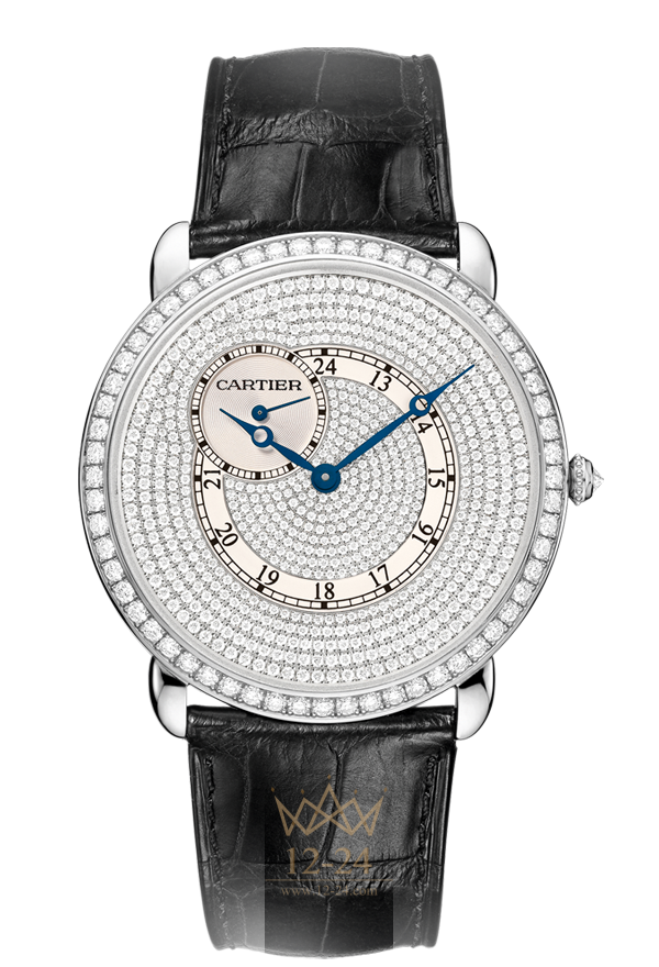 Римские цифры, синие стрелки в форме мечей, заводное устройство с сапфиром в форме кабошона, шкала в стиле “железная дорога”. Ronde Louis Cartier – классика часового искусства Cartier. Все модели из розового или белого золота, стандартные или украшенные бриллиантами, оснащены ремешком из кожи аллигатора.