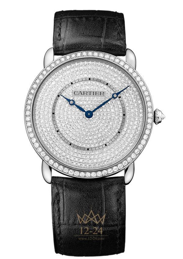 Часы Ronde Louis Cartier, большая модель, диаметр 36 мм. Механизм с ручным заводом, калибр 430 MC. Корпус из белого золота 18 карат с 68 бриллиантами, заводная головка с зернистой отделкой и бриллиантом, общий вес бриллиантов 0,73 карата. Циферблат из белого золота 18 карат с 490 бриллиантами общим весом 1,67 карата. Брегетные стрелки из вороненой стали. Сапфировое стекло. Ремешок из полуматовой кожи аллигатора черного цвета, регулируемая раскладывающаяся застежка из белого золота 18 карат украшена 37 бриллиантами общим весом 0,29 карата, длина застежки 18 мм. Задняя крышка из сапфирового стекла. Высота корпуса: 7,01 мм. Водонепроницаемость до 30 метров.