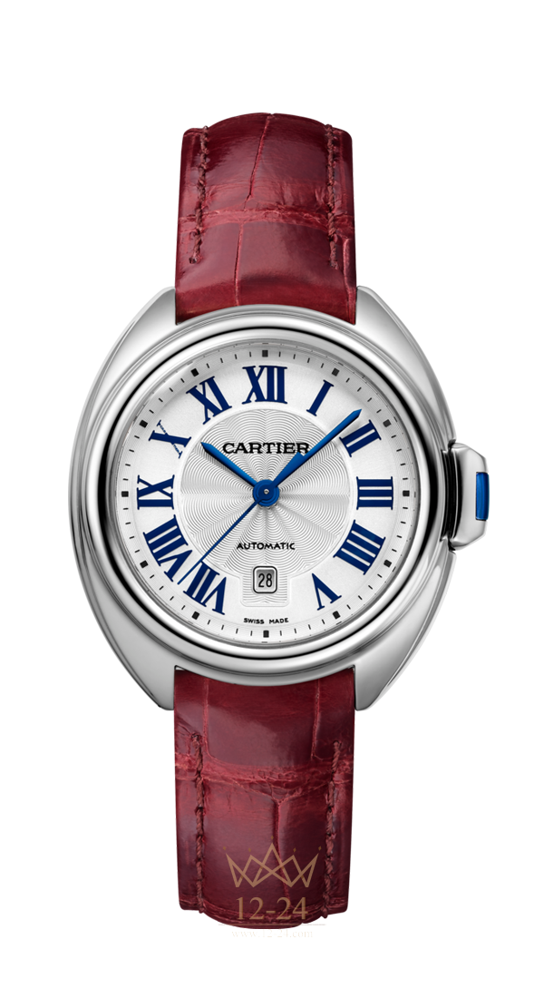 Часы Clé de Cartier (WSCL0016) 31 мм, механизм с автоматическим подзаводом. Корпус из стали, ключ с синтетической шпинелью, посеребренный опаловый циферблат с эффектом «солнечные лучи», стрелки в форме мечей из вороненой стали, сапфировое стекло, ремешок из блестящей кожи аллигатора бордового цвета, двойная регулируемая раскладывающаяся застежка из стали. Высота корпуса: 11,04 мм. Водонепроницаемость до 3 бар (около 30 метров).