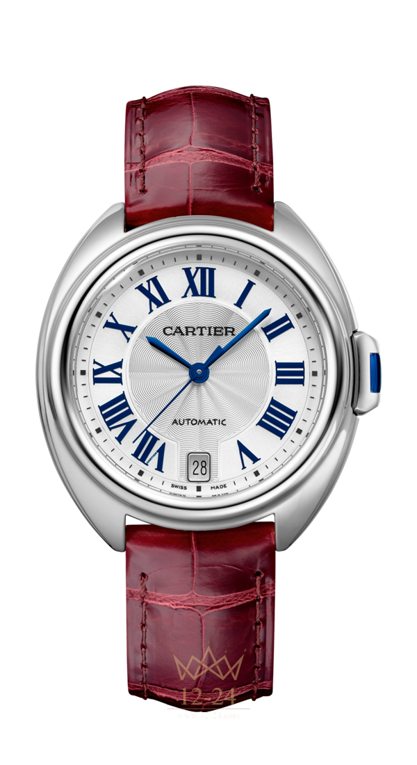 Часы Clé de Cartier (WSCL0017) 35 мм, механизм с автоматическим подзаводом, калибр 1847 MC. Корпус из стали, ключ с синтетической шпинелью, посеребренный опаловый циферблат с эффектом «солнечные лучи», стрелки в форме мечей из вороненой стали, стекло и задняя крышка из сапфирового стекла, ремешок из блестящей кожи аллигатора бордового цвета, двойная регулируемая раскладывающаяся застежка из стали. Высота корпуса: 10,09 мм. Водонепроницаемость до 3 бар (около 30 метров).
