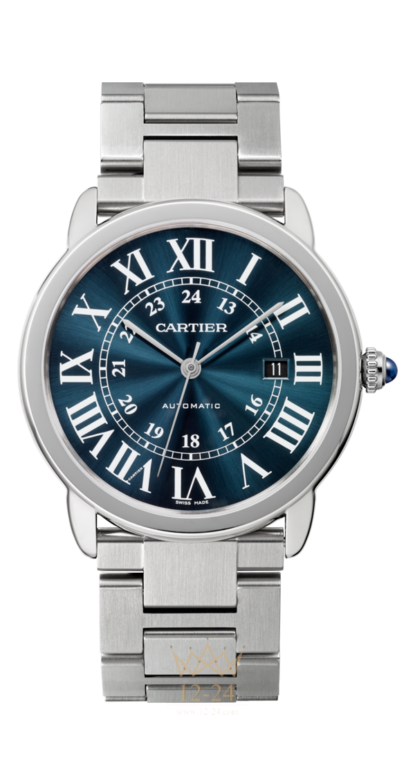 Часы Ronde Solo de Cartier (WSRN0023) 42 мм, механизм с автоматическим подзаводом. Корпус из стали, заводная головка с зернистой отделкой и синтетической шпинелью в форме кабошона, синий циферблат, стрелки в форме мечей из полированной стали, сапфировое стекло, браслет из стали, окошко календаря в положении «3 часа». Высота корпуса: 8,36 мм. Водонепроницаемость до 3 бар (~30 метров).