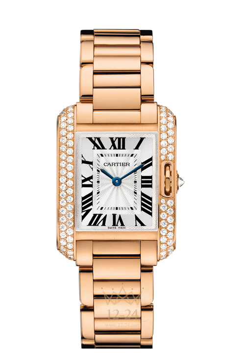 Часы Anglaise, маленькая модель, кварцевый механизм, калибр Cartier 057. Корпус из розового золота 18 карат украшен 81 бриллиантами, девятигранная заводная головка с бриллиантом, общий вес бриллиантов 0,8 карата. Посеребренный гильошированный в технике flinqué циферблат с лаковым покрытием. Стрелки в форме мечей из вороненой стали. Сапфировое стекло. Браслет из розового золота 18 карат. Размеры корпуса: 30,2 мм x 22,7 мм. Высота корпуса: 7,19 мм. Водонепроницаемость до 30 метров.