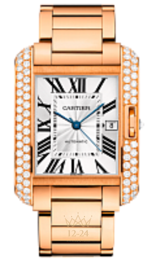 Часы Tank Anglaise, большая модель, механизм с автоматическим подзаводом, калибр 1904 MC. Корпус из розового золота 18 карат украшен 79 бриллиантами, девятигранная заводная головка с бриллиантом, общий вес бриллиантов 2,92 карата. Посеребренный гильошированный в технике flinqué циферблат с лаковым покрытием. Стрелки в форме мечей из вороненой стали. Сапфировое стекло. Браслет из розового золота 18 карат. Высота корпуса: 9,5 мм. Водонепроницаемость до 30 метров.
