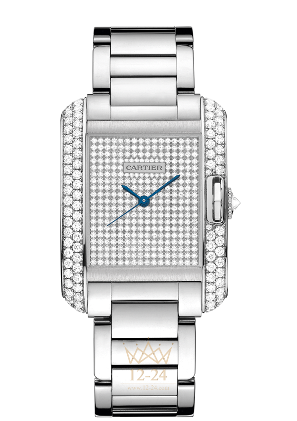 Часы Anglaise, средняя модель, механизм с автоматическим подзаводом, калибр Cartier 076. Корпус из белого золота 18 карат с родиевым покрытием украшен 89 бриллиантами, девятигранная заводная головка с бриллиантом, общий вес бриллиантов 1,74 карата. Циферблат из белого золота 18 карат с родиевым покрытием украшен 300 бриллиантами общим весом 0,78 карата. Стрелки в форме мечей из вороненой стали. Сапфировое стекло. Браслет из белого золота 18 карат с родиевым покрытием. Размеры корпуса: 39,2 мм x 29,8 мм. Высота корпуса: 9,5 мм. Водонепроницаемость до 30 метров.