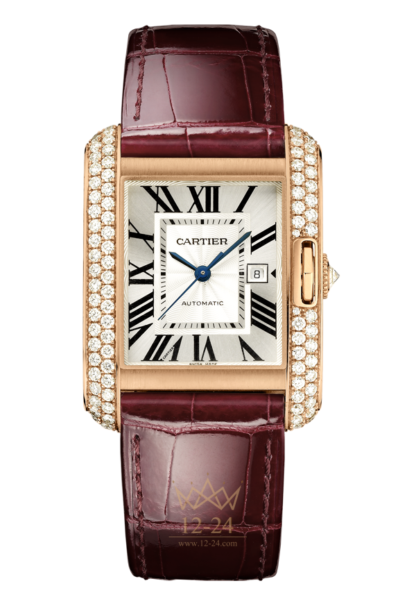 Часы Anglaise, средняя модель, механизм с автоматическим подзаводом, калибр Cartier 077. Корпус из розового золота 18 карат с 89 бриллиантами, девятигранная заводная головка с бриллиантом, общий вес бриллиантов 1,74 карата. Посеребренный гильошированный в технике flinqué циферблат с лаковым покрытием. Стрелки в форме мечей из вороненой стали. Сапфировое стекло. Ремешок из блестящей кожи аллигатора бордового цвета, двойная регулируемая раскладывающаяся застежка из розового золота 18 карат, длина застежки 18 мм. Размеры корпуса: 39,2 мм x 29,8 мм. Высота корпуса: 9,5 мм. Водонепроницаемость до 30 метров.