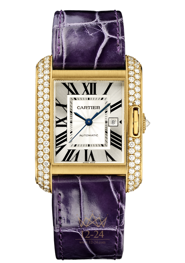 Часы Anglaise, средняя модель, механизм с автоматическим подзаводом, калибр Cartier 077. Корпус из желтого золота 18 карат с 89 бриллиантами, девятигранная заводная головка с бриллиантом, общий вес бриллиантов 1,74 карата. Посеребренный гильошированный в технике flinqué циферблат с лаковым покрытием. Стрелки в форме мечей из вороненой стали. Сапфировое стекло. Ремешок из блестящей кожи аллигатора баклажанового цвета, двойная регулируемая раскладывающаяся застежка из желтого золота 18 карат, длина застежки 18 мм. Размеры корпуса: 39,2 мм x 29,8 мм. Высота корпуса: 9,5 мм. Водонепроницаемость до 30 метров.