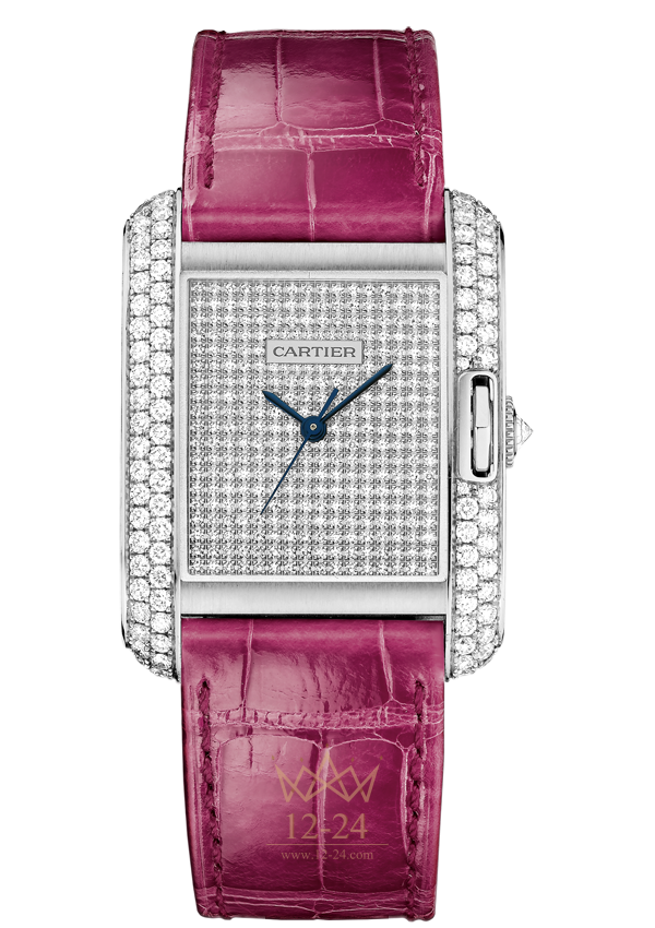 Часы Anglaise, средняя модель, механизм с автоматическим подзаводом, калибр Cartier 076. Корпус из белого золота 18 карат с родиевым покрытием украшен 89 бриллиантами, девятигранная заводная головка с бриллиантом, общий вес бриллиантов 1,74 карата. Циферблат из белого золота 18 карат с родиевым покрытием украшен 300 бриллиантами общим весом 0,78 карата. Стрелки в форме мечей из вороненой стали. Сапфировое стекло. Ремешок из блестящей кожи аллигатора цвета фуксии, двойная регулируемая раскладывающаяся застежка из белого золота 18 карат с родиевым покрытием украшена 43 бриллиантами общим весом 0,42 карата, длина застежки 18 мм. Размеры корпуса: 39,2 мм x 29,8 мм. Высота корпуса: 9,5 мм. Водонепроницаемость до 30 метров.
