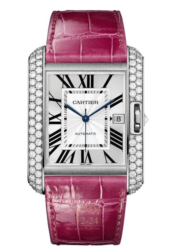 Часы Anglaise, большая модель, механизм с автоматическим подзаводом, калибр 1904 MC. Корпус из белого золота 18 карат с родиевым покрытием украшен 79 бриллиантами, девятигранная заводная головка с бриллиантом, общий вес бриллиантов 2,92 карата. Посеребренный гильошированный в технике flinqué циферблат с лаковым покрытием. Стрелки в форме мечей из вороненой стали. Сапфировое стекло. Ремешок из блестящей кожи аллигатора цвета фуксии, двойная регулируемая раскладывающаяся застежка из белого золота 18 карат с родиевым покрытием, длина застежки 20 мм. Размеры корпуса: 39,2 мм x 29,8 мм. Высота корпуса: 9,82 мм. Водонепроницаемость до 30 метров.