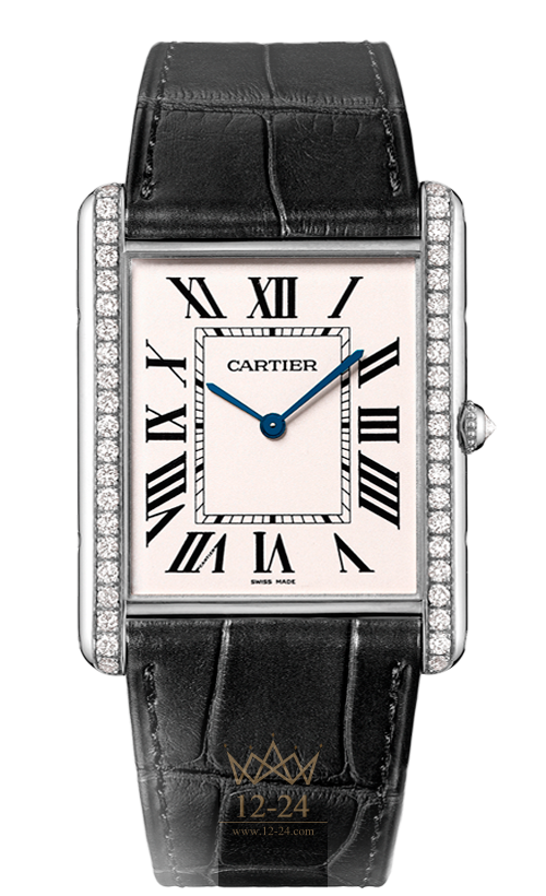 Часы Tank Louis Cartier, модель XL, механизм с ручным заводом, калибр 430 MC. Корпус из белого золота 18 карат с родиевым покрытием украшен 42 бриллиантами, заводная головка с зернистой отделкой и бриллиантом, общий вес бриллиантов 0,92 карата. Посеребренный циферблат с круговым зернением. Стрелки в форме мечей из вороненой стали. Минеральное стекло. Ремешок из полуматовой кожи аллигатора черного цвета, двойная регулируемая раскладывающаяся застежка из белого золота 18 карат, длина застежки 18 мм. Размеры корпуса: 40,4 мм x 34,9 мм. Высота корпуса: 5,1 мм. Водонепроницаемость до 20 метров.