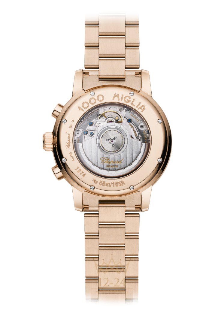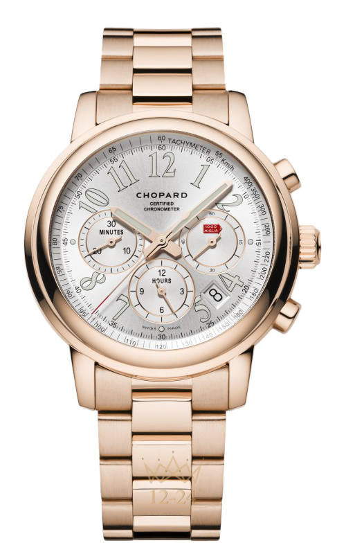 Являясь официальным хронометристом самого известного в мире регулярного ретро-ралли, компания Chopard выпустила в честь него автоматические механические часы Mille Miglia Chronograph в корпусе из розового золота 750 пробы на золотом браслете. Часы созданы под вдохновением от красоты и элегантности ретро-автомобилей. Их серый сатинированный циферблат в духе приборной панели и сертифицированный как хронометр механизм демонстрируют идеальный синтез автомобильного дизайна и часовой механики.