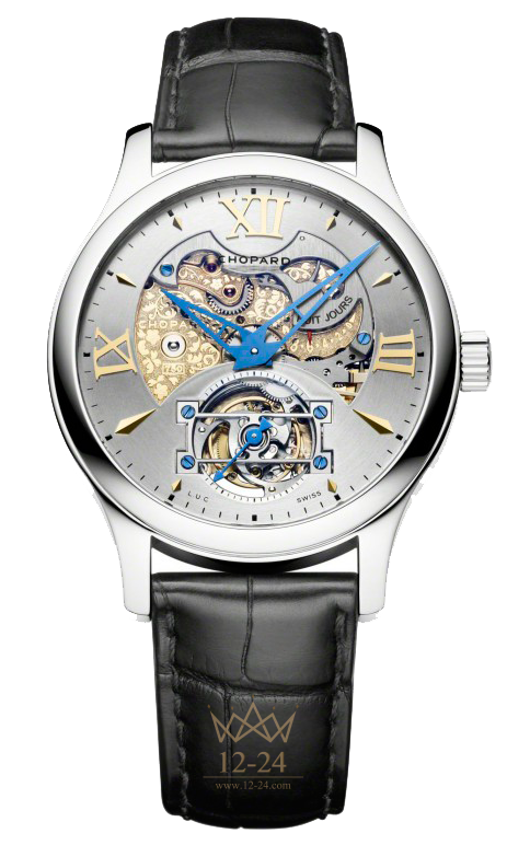В часах L.U.C Tourbillon Esprit de Fleurier из белого золота 750 пробы умело применена техника гравировки Fleurisanne. Она характеризуется выпуклым рельефом, который получают, удаляя металл по контуру рисунка. Мосты и платина часового механизма L.U.C Calibre 02.10-L1 изготовлены из золота 750 пробы, а их изысканная отделка видна сквозь скелетонизированный циферблат и прозрачную заднюю крышку корпуса.