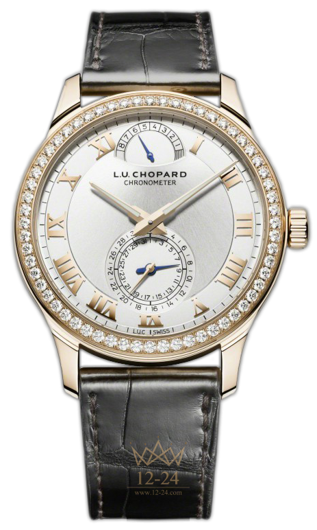 Часы L.U.C Quattro в инкрустированном бриллиантами корпусе из розового золота 750 пробы имеют классический, но незаурядный дизайн. Под элегантным серебристым циферблатом 43-миллиметрового корпуса находится часовой механизм L.U.C Calibre 98.01-L. Созданный талантливыми мастерами, он, несмотря на очень малую толщину, обладает 9-дневным запасом хода, который обеспечивается технологией L.U.C Quattro. Эта модель не только имеет сертификат хронометра, но и отмечена престижным знаком Poinçon de Genève.