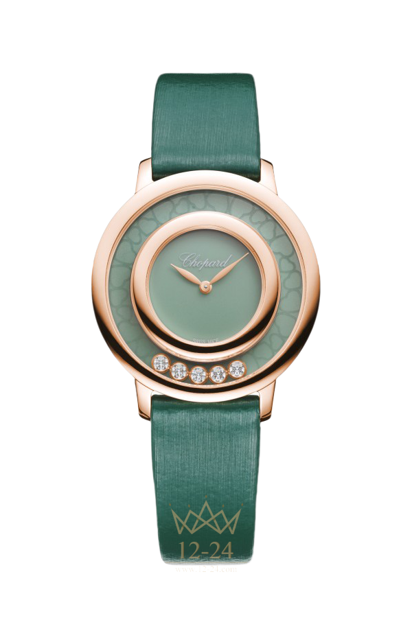 Завораживающий концентрический узор из агата и розового золота 750 пробы подчеркивает драгоценное сияние модели. Внутреннее кольцо служит обрамлением циферблату из агата, в то время как внешнее соответствует контурам корпуса. В пространстве между ними на зеленом агатовом фоне кружатся в сверкающем танце пять знаменитых подвижных бриллиантов Chopard.